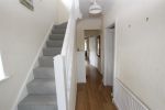 Staircase to the first floor, ceiling covings, understairs storage, built in storage unit, timber flooring.