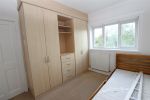 Range of fitted wardrobes to one wall with matching dressing table, built in shelving, double radiator.