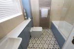 Three piece suite in white comprising of bath with Mira shower, feature built in vanity unit in Blue with low flush toilet and wash hand basin. Fully tiled walls, tiled flooring, recessed eye ball lighting, towel rail.