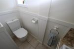 Two piece suite in white comprising of low flush toilet, built in vanity unit with wash hand basin, half timber panel walls.