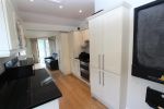 Range of modern fitted wall and base units with contrasting granite worktops incorporating bowl and a half sink unit, electric Neff hob and oven, built in microwave, built in fridge freezer, built in dish washer, recessed eye ball lighting, timber flooring.